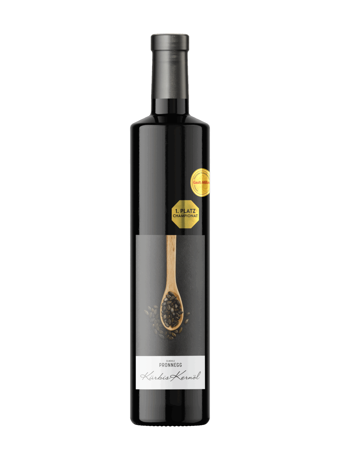 Zahlreiche Auszeichnungen bestätigen die Qualität: 1. Platz Kürbiskernöl-Championat, Sieg beim Öl-Kaiser in Wieselburg und GAULT MILLAU Medaille